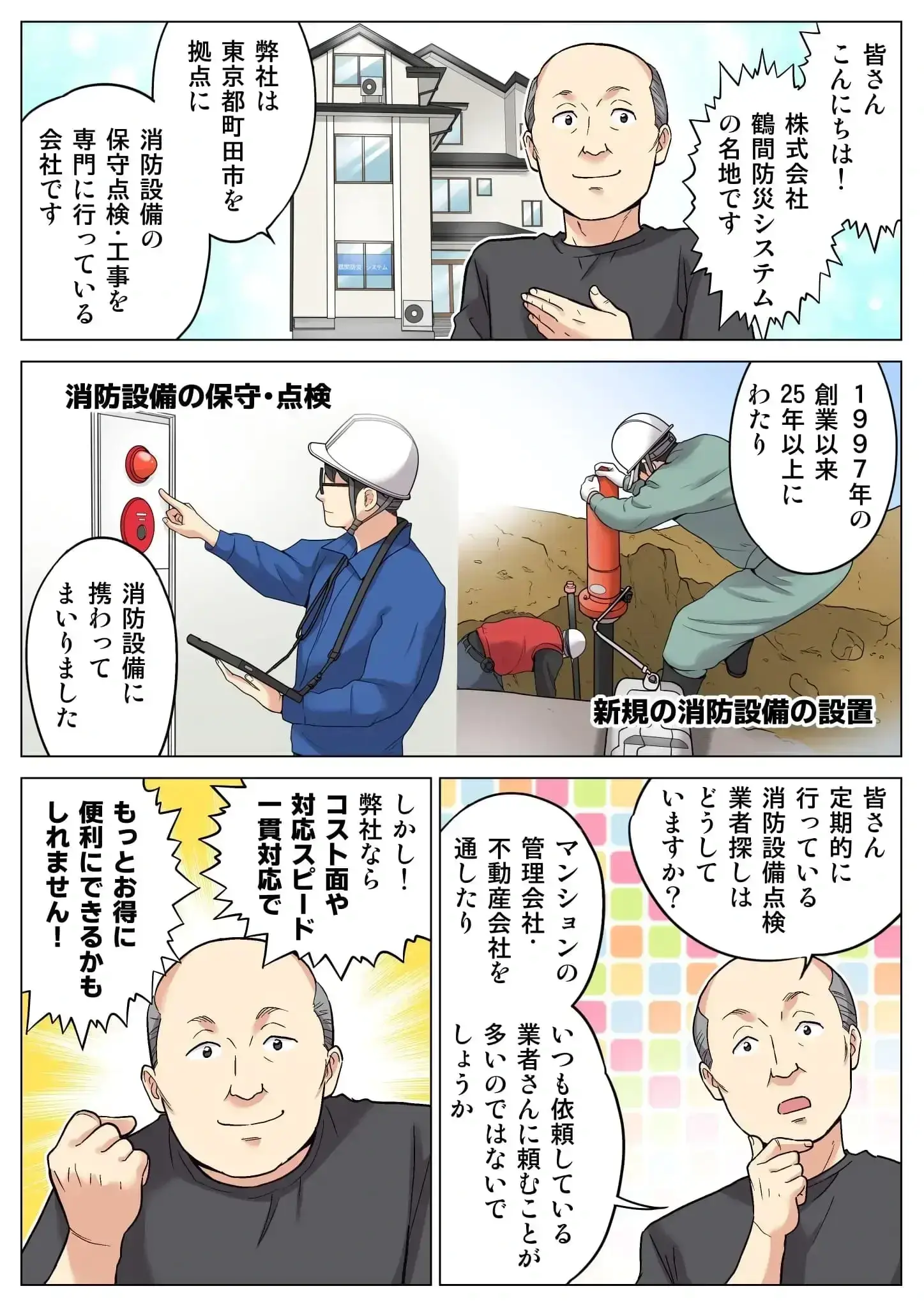 鶴間防災システムの使命は消防設備を確実に作動させ、皆様の安全と命を守ることです。資格を持った専門のスタッフと共に、消防設備業に携わって30年以上の豊富な経験を活かし、より安全で安心な環境をお届けします。また、弊社は消防設備工事から保守・点検まで自社一貫対応しており管理会社や不動産会社を挟まず直接ご依頼いただくことで、費用・時間ともに