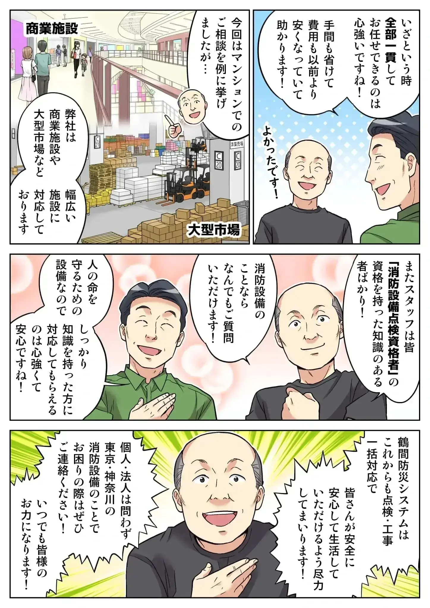 鶴間防災システムは、お客様のお悩みに真摯に寄り添い、施工を行います。「金額を抑えたい」「作業の曜日や時間帯の調整」など、消防設備点検や工事を行うにあたり発生する様々なご要望に応え、一つ一つのご依頼を専門知識と豊富な経験をもってご対応いたします。